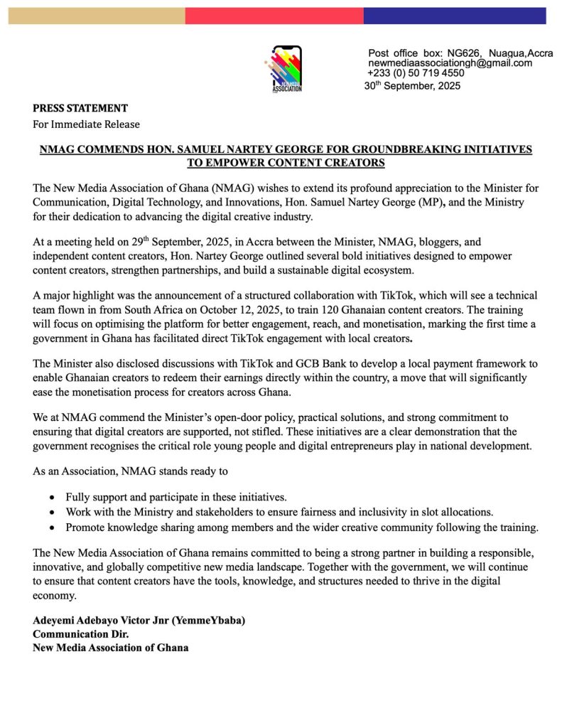 The New Media Association of Ghana Commends Hon. Samuel Nartey George (MP) for Groundbreaking Initiatives to Empower Content Creators
