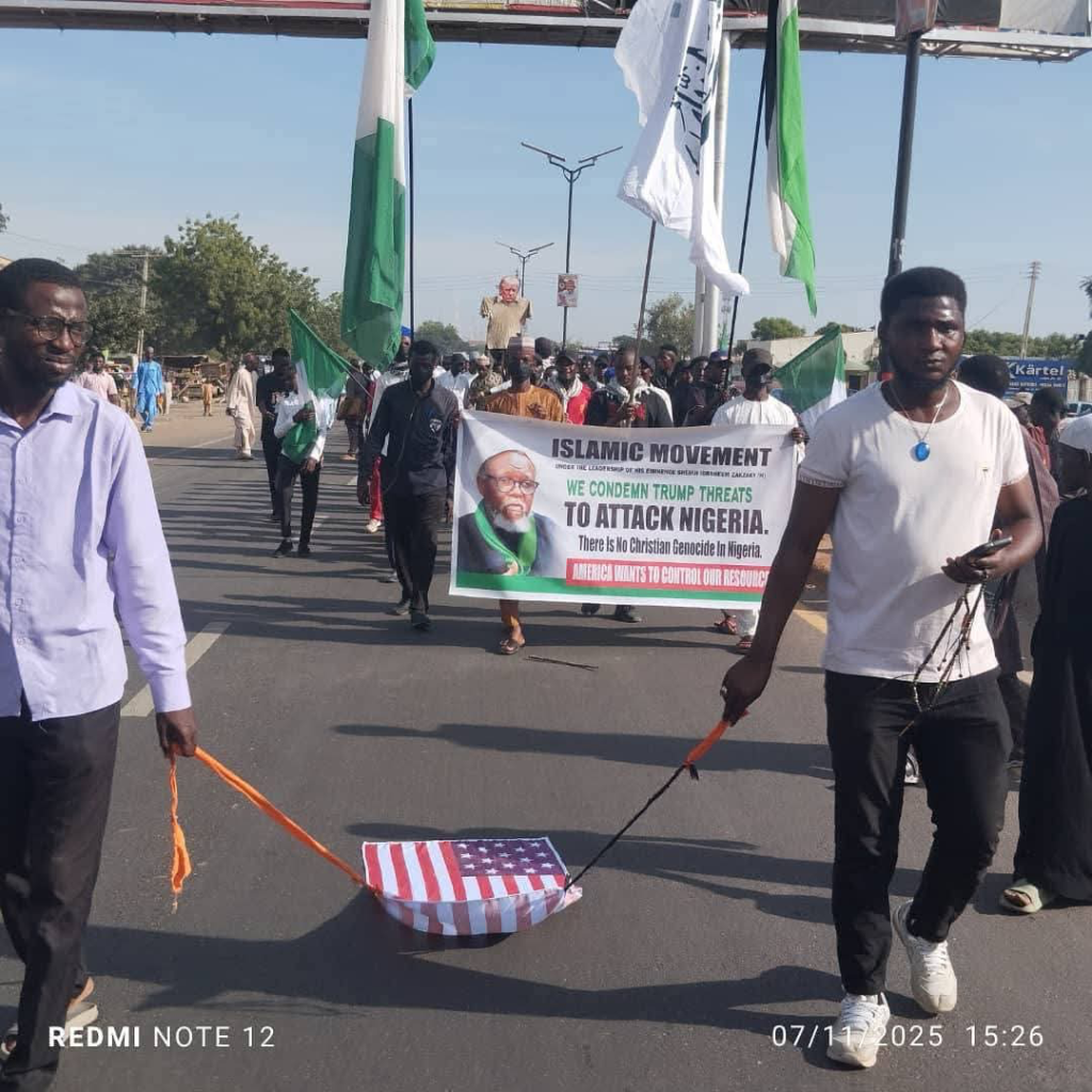 They were seen displaying placards with different inscriptions such as ‘We condemn Trump’s threat to attack Nigeria’, ‘There is no Christian genocide in Nigeria’, ‘America wants to control our resources’, amongst others.